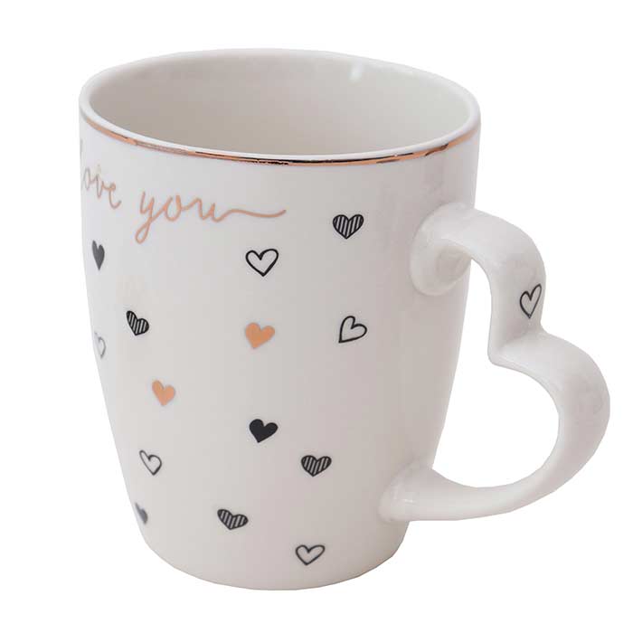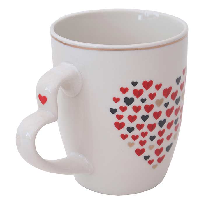 Tazza con manico in ceramica bianca e decorazione cuore, in due fantasie assortite.