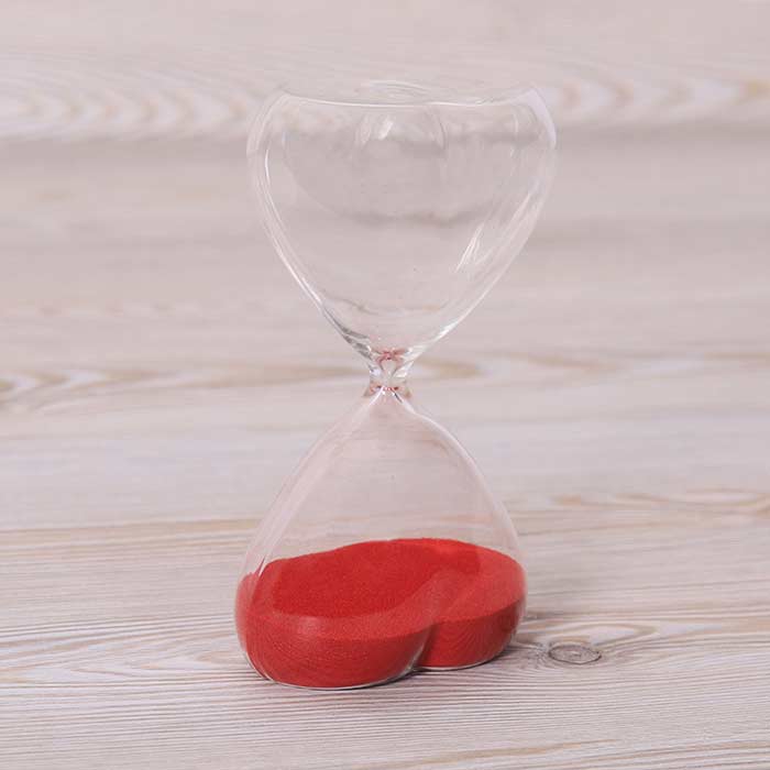 Clessidra a forma di cuore realizzata in vetro trasparente, con sabbia color rosso, durata 15 minuti.