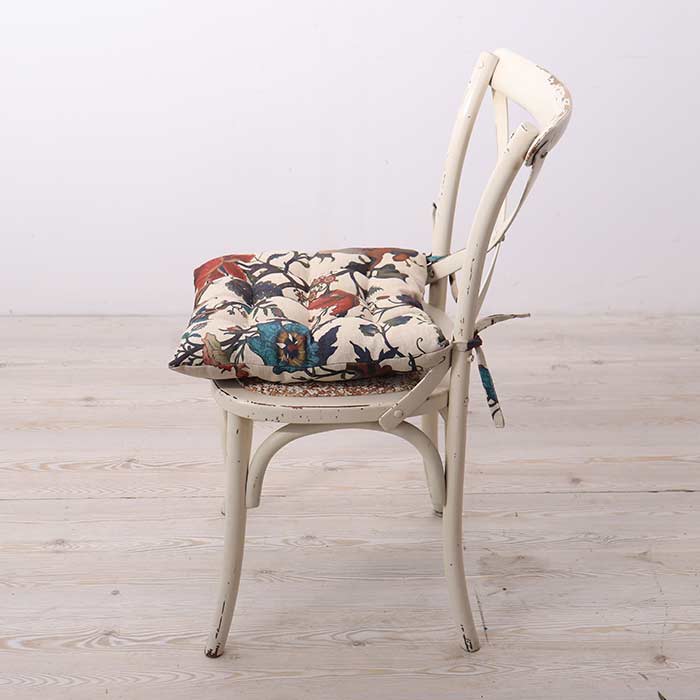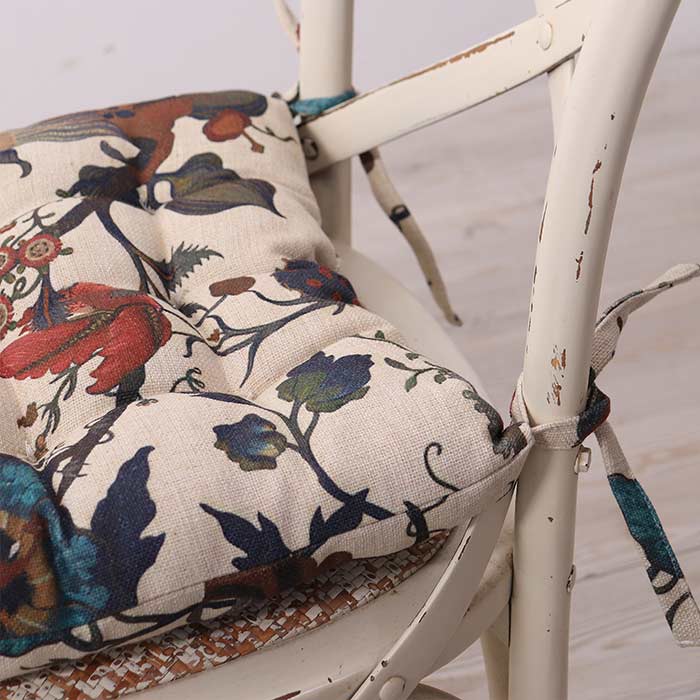 Cuscino imbottito per sedia realizzato in misto cotone, con stampa su entrambi i lati, e nastri per fissaggio.