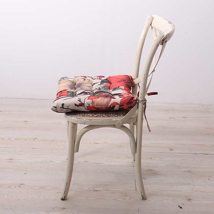Cuscino imbottito per sedia realizzato in misto cotone, con stampa su entrambi i lati, e nastri per fissaggio.