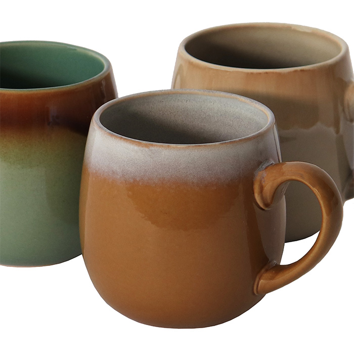 Mug con manico in ceramica in tre colori assortiti: beige, marrone e verde, con effetto sfumato.