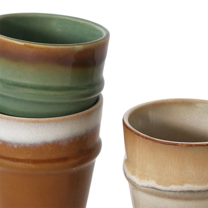 Mug in ceramica in tre colori assortiti: beige, marrone e verde, con effetto sfumato.