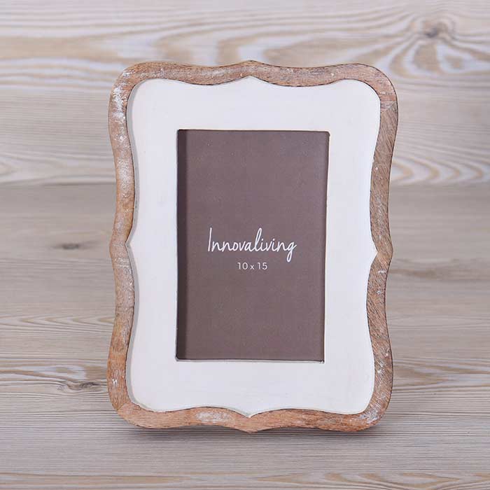 Portafoto con struttura in MDF e cornice in legno di mango finitura white wash. Per foto 10x15