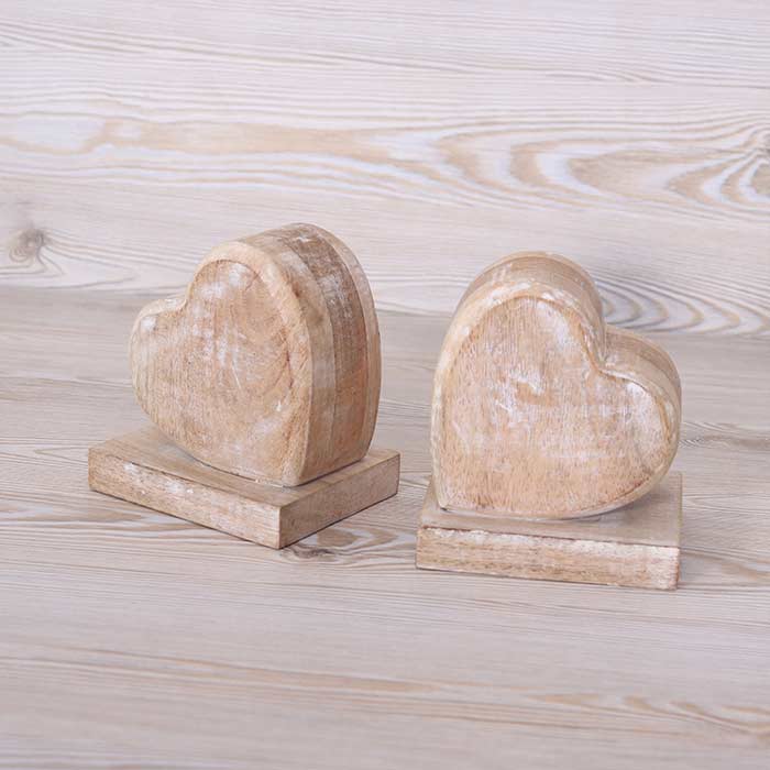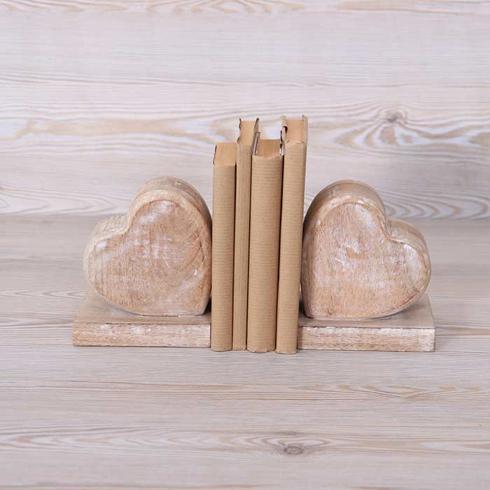 Set due fermalibri realizzati in legno di mango, finitura white wash, con decorazione a forma di cuore.
