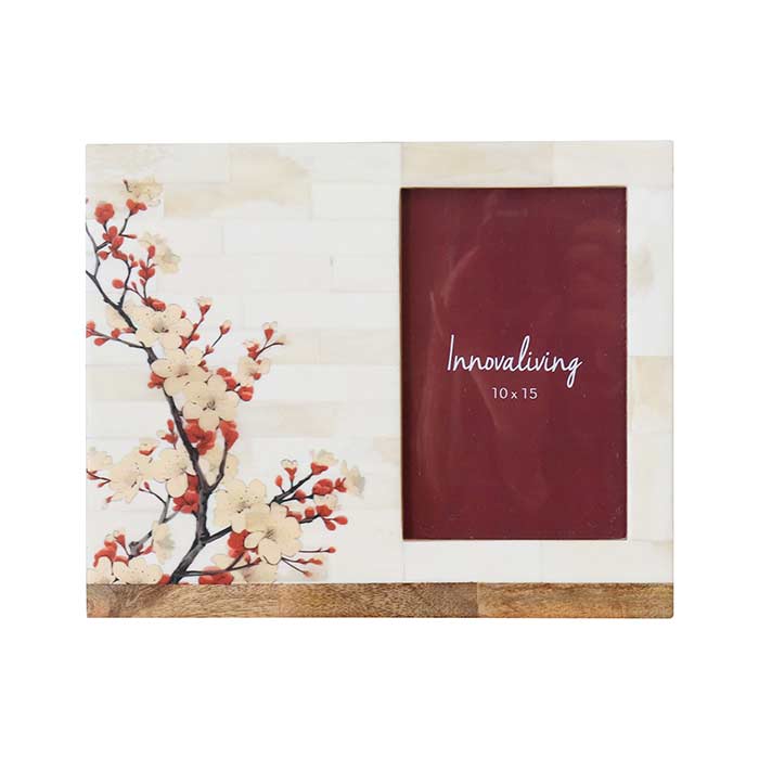 Portafoto con struttura in legno e cornice in osso stampato con decoro floreale. Per foto 10x15
