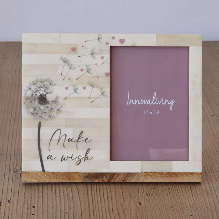 Portafoto con struttura in legno e cornice in osso stampato con decoro floreale. Per foto 13x18