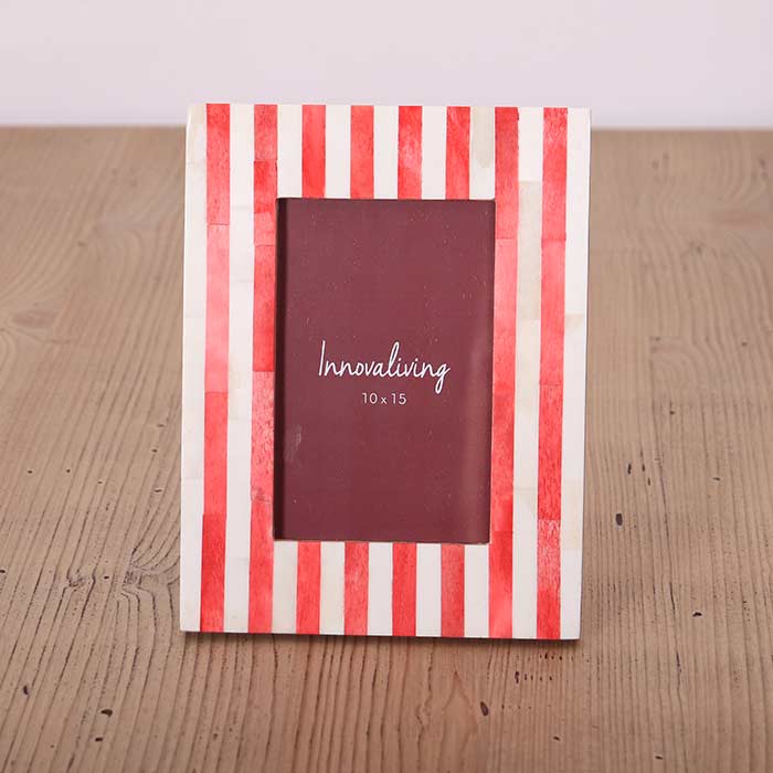 Portafoto con struttura in legno e cornice in osso con decoro a righe rosso e bianco. Per foto 10x13