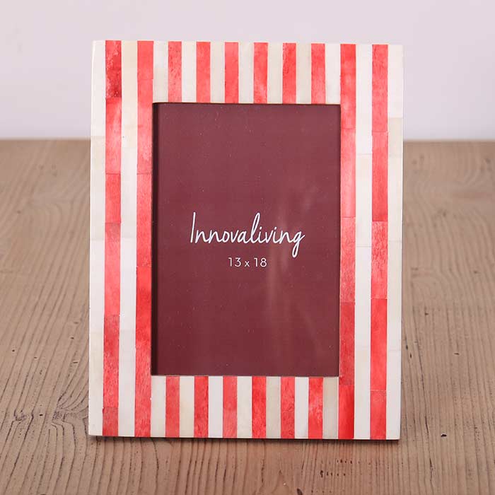 Portafoto con struttura in legno e cornice in osso con decoro a righe rosso e bianco. Per foto 13x18
