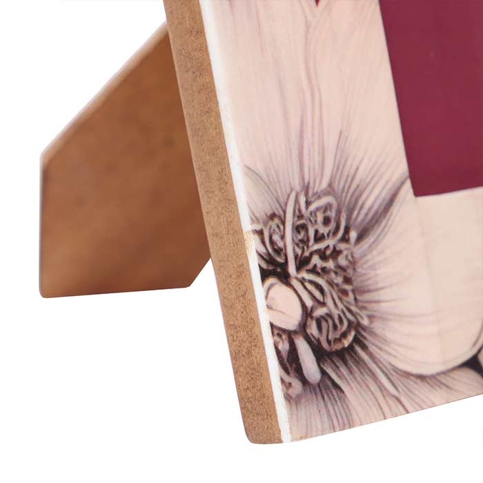Portafoto con struttura in legno e cornice in osso stampato con decoro floreale. Per foto 10x15