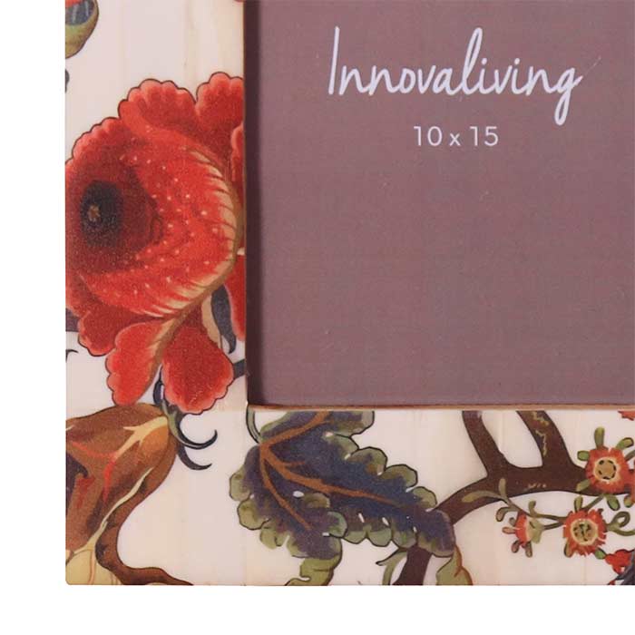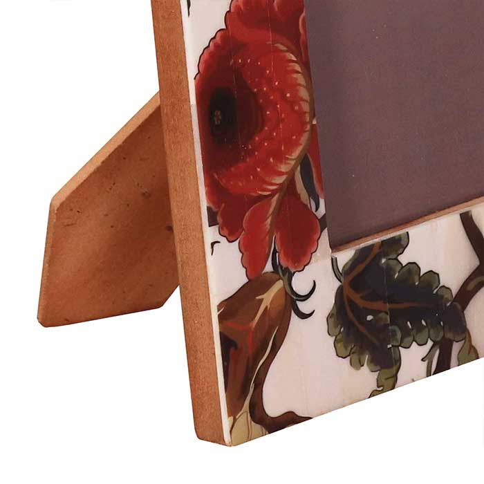 Portafoto con struttura in legno e cornice in osso stampato con decoro floreale. Per foto 10x15