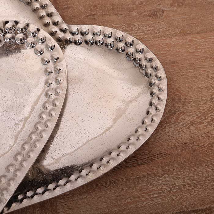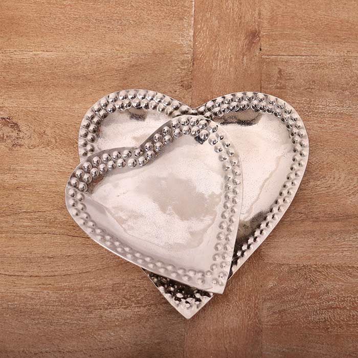 Set due contenitori a forma di cuore realizzati in alluminio, finitura argento anticata, con decorazione in rilievo sul bordo.