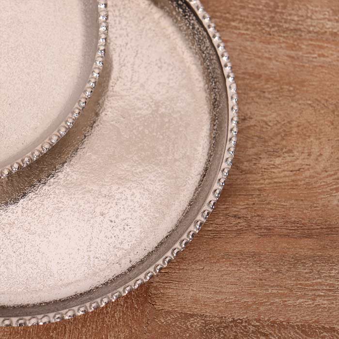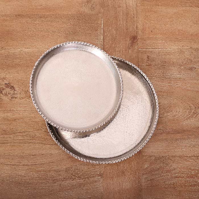 Set due contenitori tondi realizzati in alluminio, finitura argento anticata, con decorazione in rilievo sul bordo.