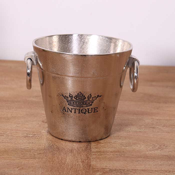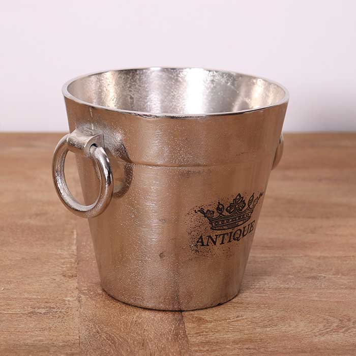 Portabottiglie in allumunio finitura raw silver con manici e scritta decorativa.