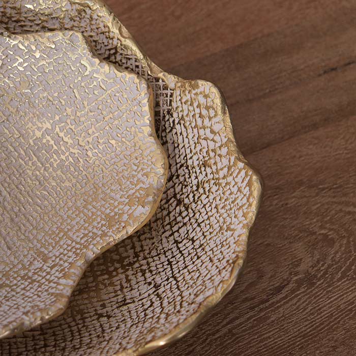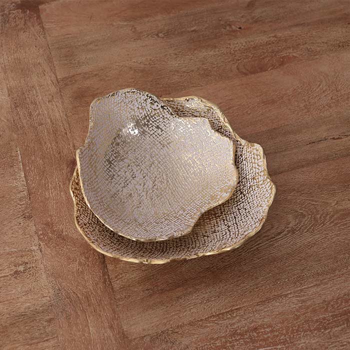 Set due contenitori tondi realizzati in alluminio, finitura bianca e oro, con trama effetto tessuto.