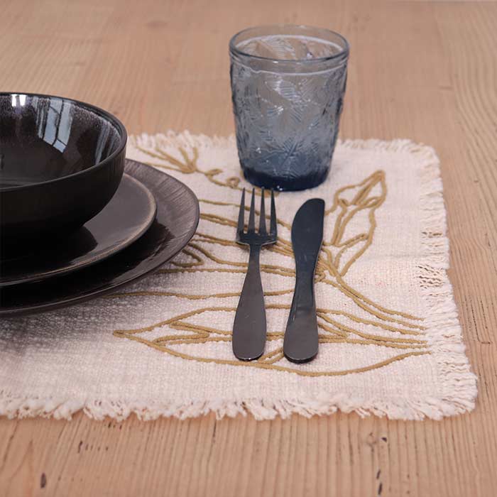 Tovaglietta realizzata in tessuto non tessuto, con frange e decorazione a tema floreale realizzata a mano.
