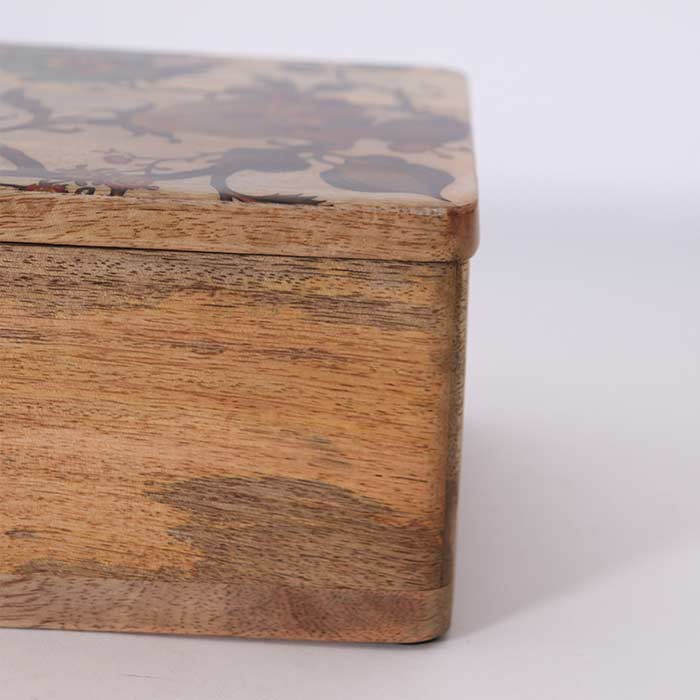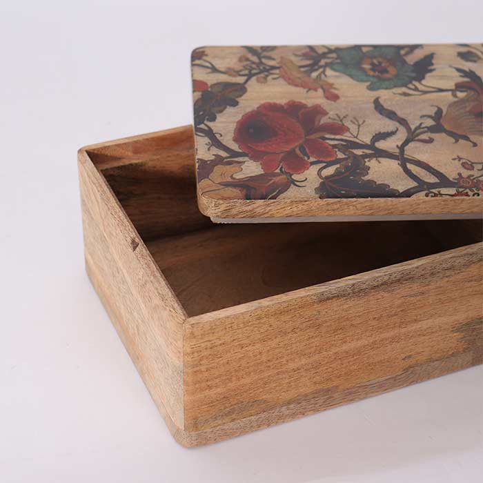 Scatola rettangolare, realizzata in legno di mango, con decorazione laccata lucida sul coperchio.