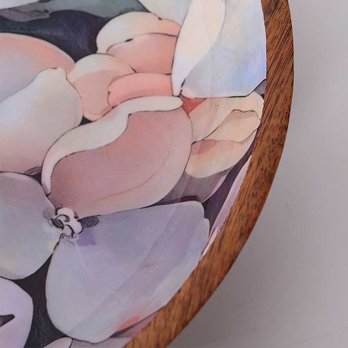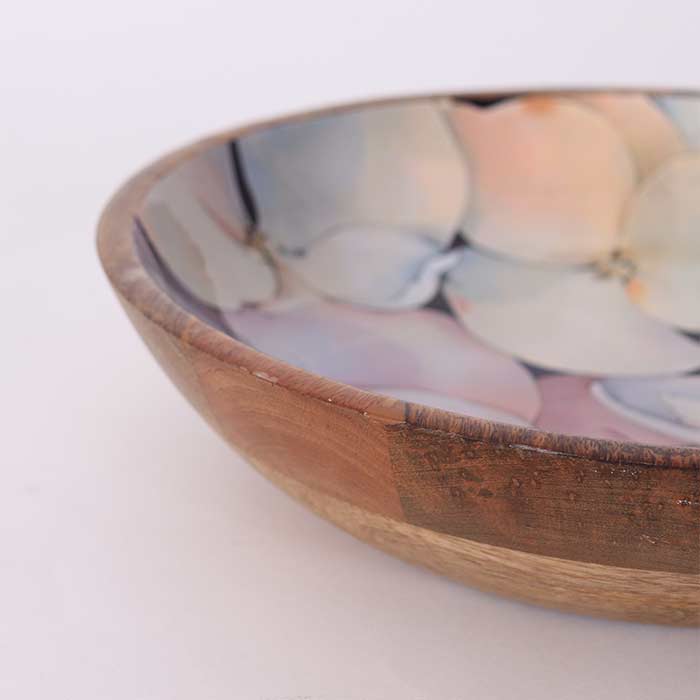 Ciotola tonda, realizzato in legno di mango, con decorazione laccata lucida.