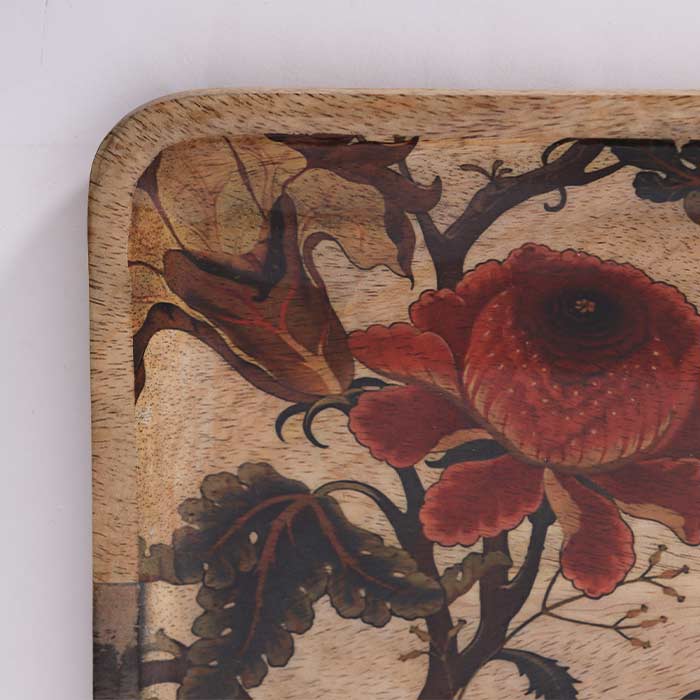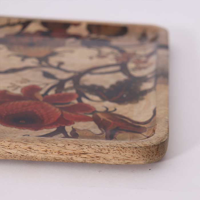 Vassoio quadrato, realizzato in legno di mango, con decorazione laccata lucida.