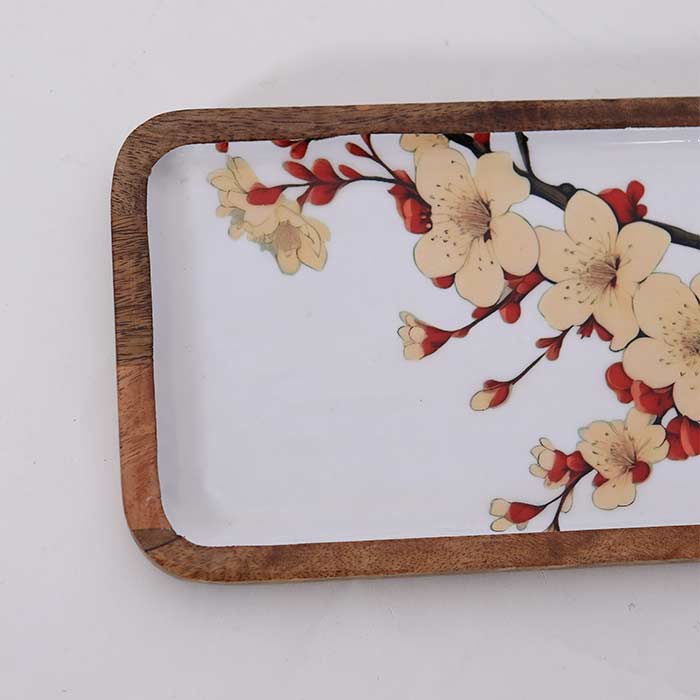 Vassoio rettangolare, realizzato in legno di mango, con decorazione laccata lucida.