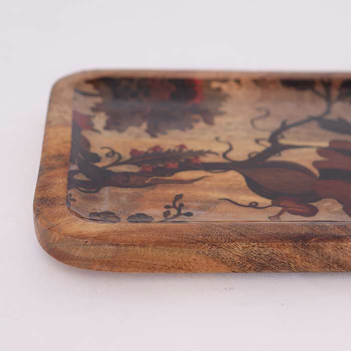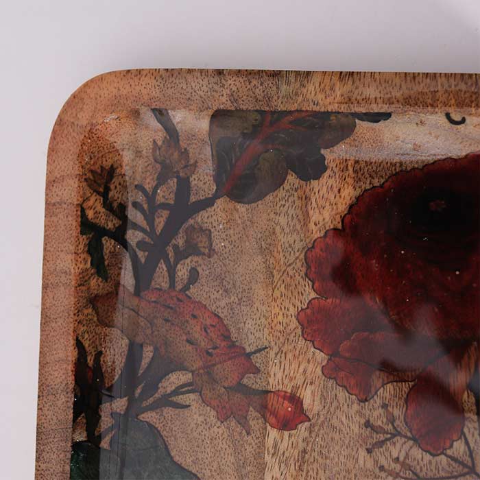 Vassoio rettangolare, realizzato in legno di mango, con decorazione laccata lucida.