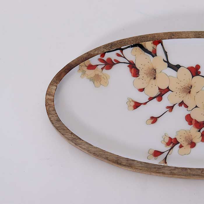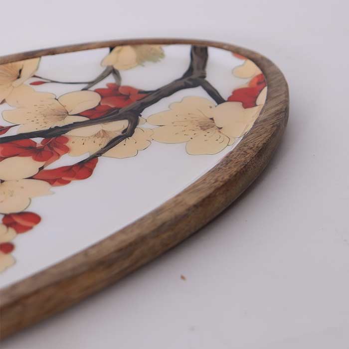 Vassoio ovale, realizzato in legno di mango, con decorazione laccata lucida.