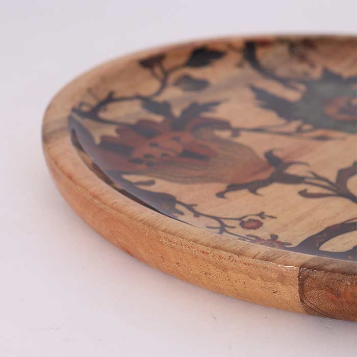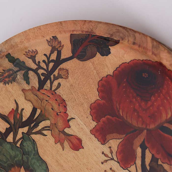 Vassoio tondo, realizzato in legno di mango, con decorazione laccata lucida.
