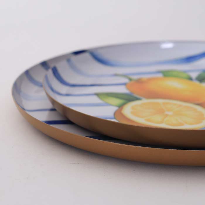 Set due vassoi di forma rotonda, realizzati in metallo, finitura con stampa a tema righe e limoni.