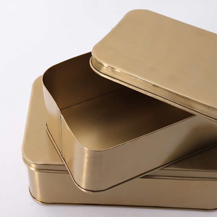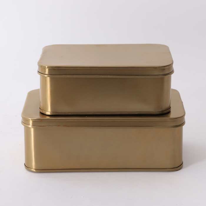 Set due scatole rettangolari con coperchio, realizzate in metallo, finitura anticata oro.