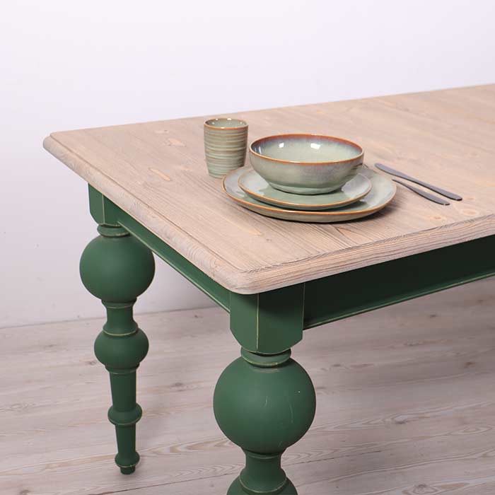 Tavolo in abete massello invecchiato, spazzolato e cerato a mano con finitura Old Wood. Dotato di quattro gambe tornite con elementi sferici di diversa misura finitura laccata verde.