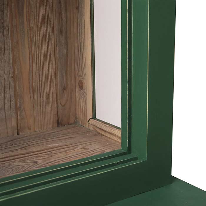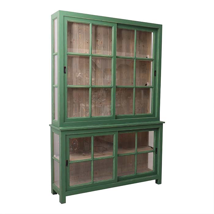 Vetrina in abete massello finitura esterna laccata verde e internamente finitura Old Wood. Composto da ante scorrevoli vetrate con maniglie in metallo anticato e ripiani rimovibili.