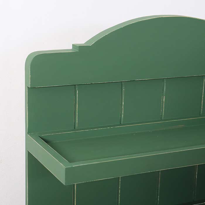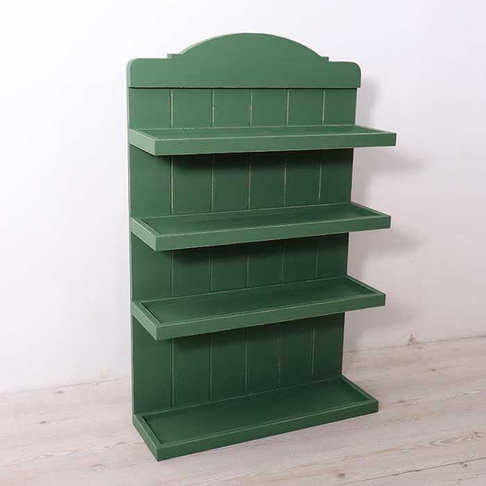Mobile in abete massello finitura laccata verde. Composto da pannello posteriore e quattro mensole.