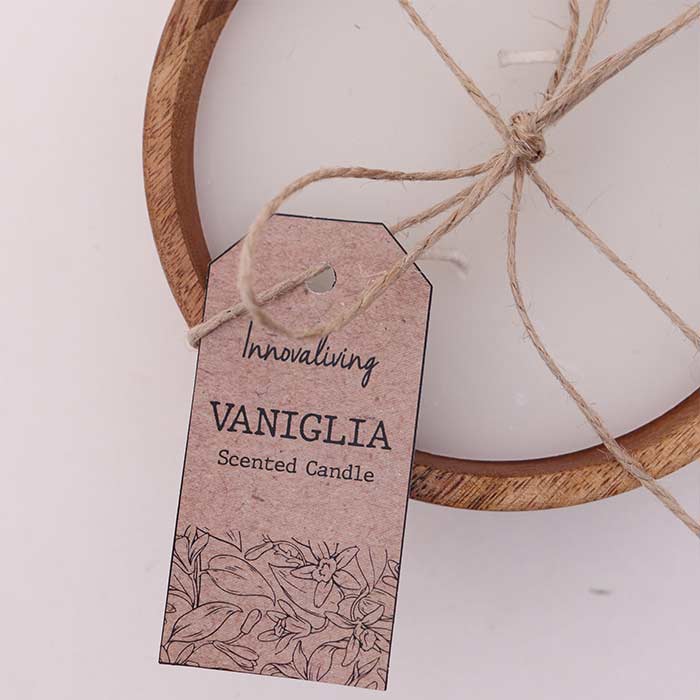 Contenitore tondo realizzato in legno, finitura naturale, con candela profumazione vaniglia, 3 stoppini.