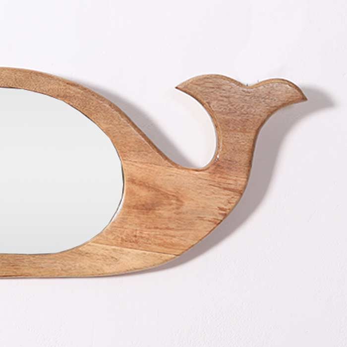 Specchio con struttura in legno naturale lavorato a forma di balena.