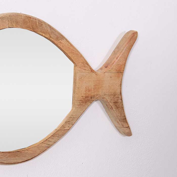 Specchio con struttura in legno naturale lavorato a forma di pesce.