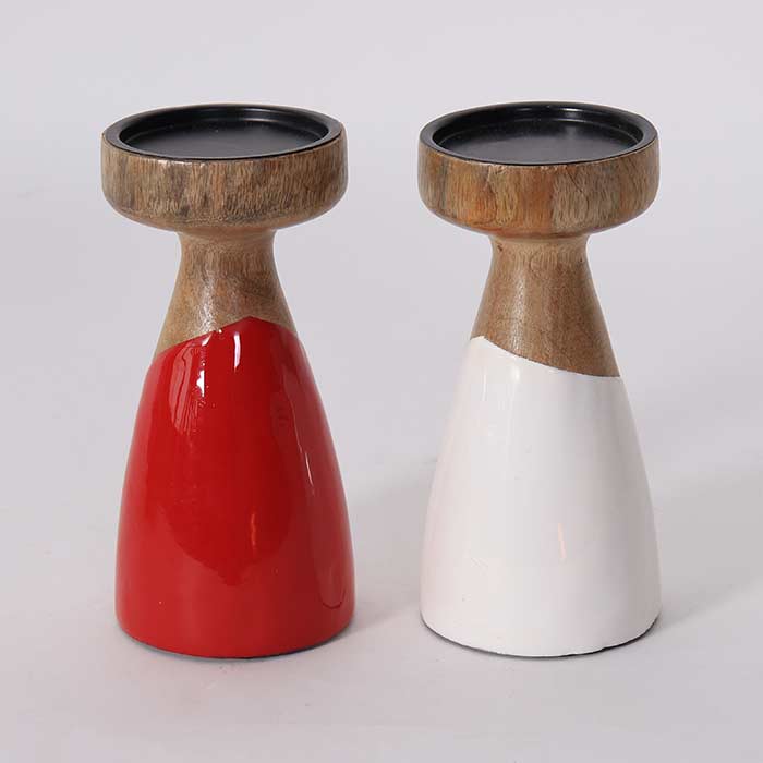 Set due portacandela realizzate in legno di mango, finitura naturale, con decorazione smaltata in due colorazioni bianco e rosso.