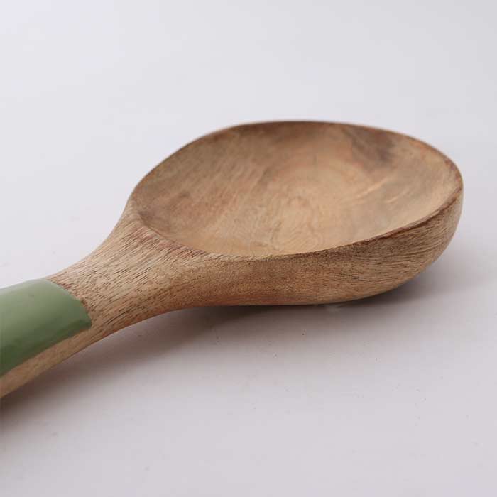 Poggiamestolo realizzato in legno di mango, con decorazione smaltata sul manico colore verde.