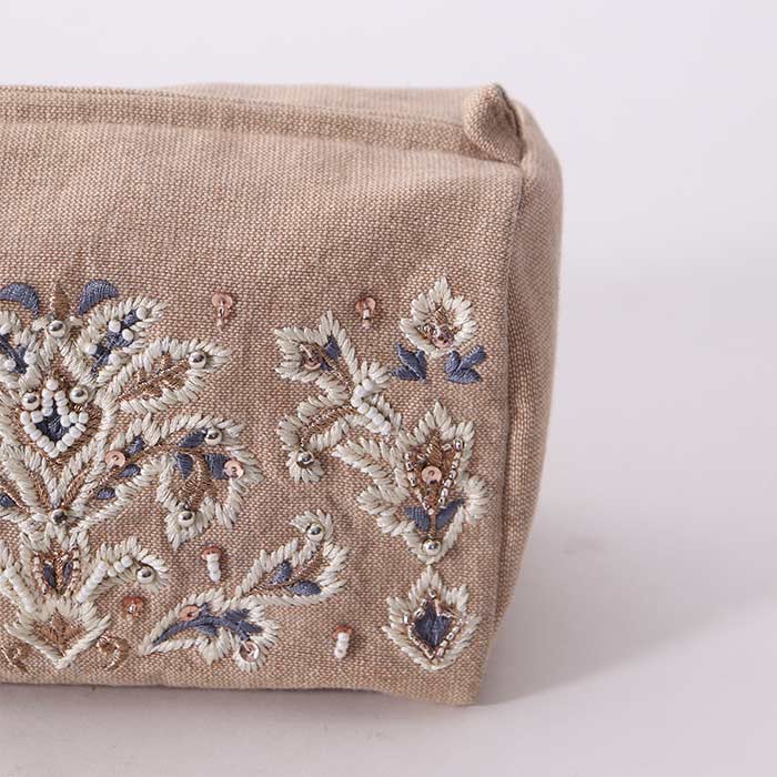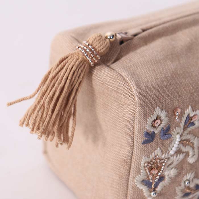 Vanity pochette in tessuto color naturale, internamente foderato e con decorazione rimata e in perline sulla parte frontale.