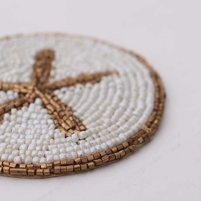 Set quattro sottobicchieri tondi con decoro stella marina, realizzati con gemme in vetro, color oro e bianco, back in tessuto.