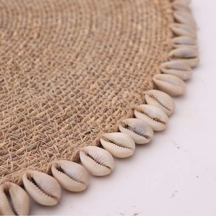 Set quattro sottopiatti tondi, realizzati in juta finitura naturale, con applicazione di conchiglie lungo il bordo.