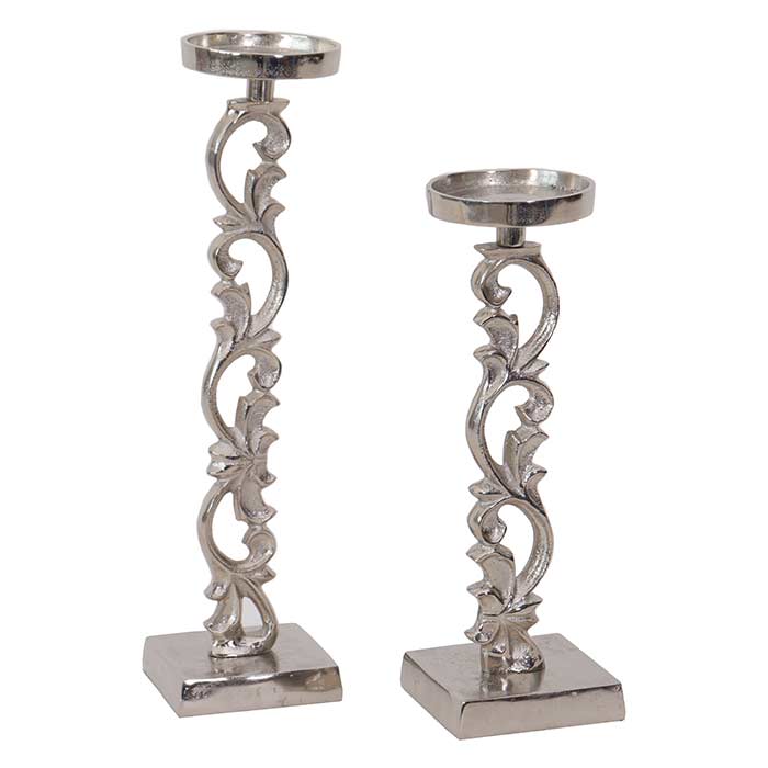 Set due portacandele realizzate in alluminio finitura raw silver.