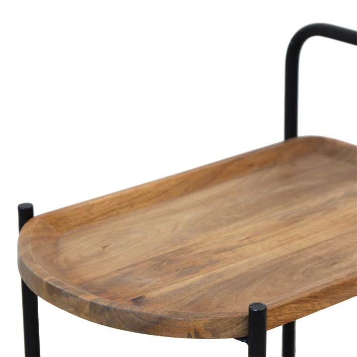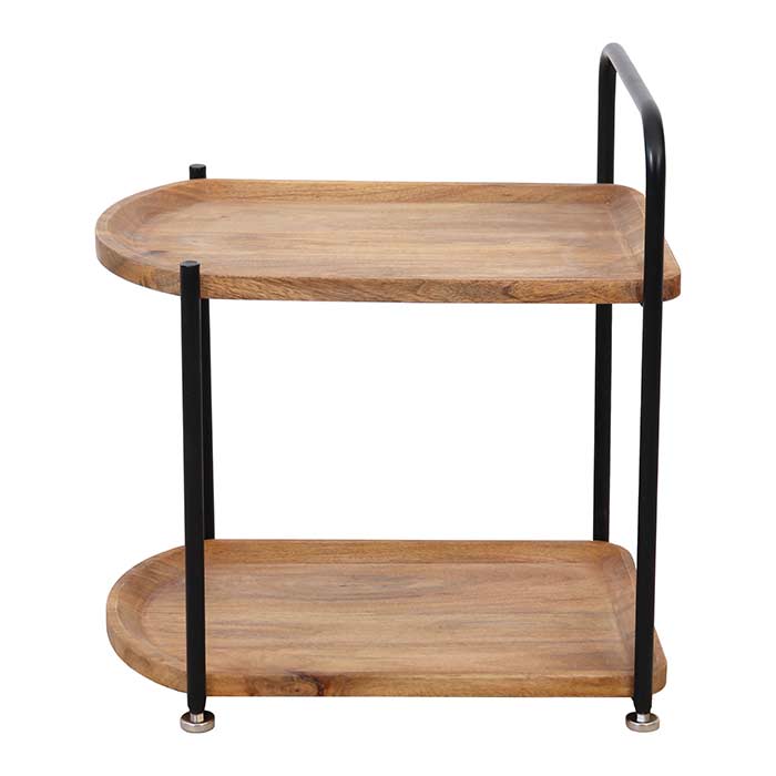 Tavolino composto da due ripiani in legno effetto warm e struttura in ferro nero opaco.