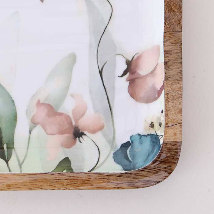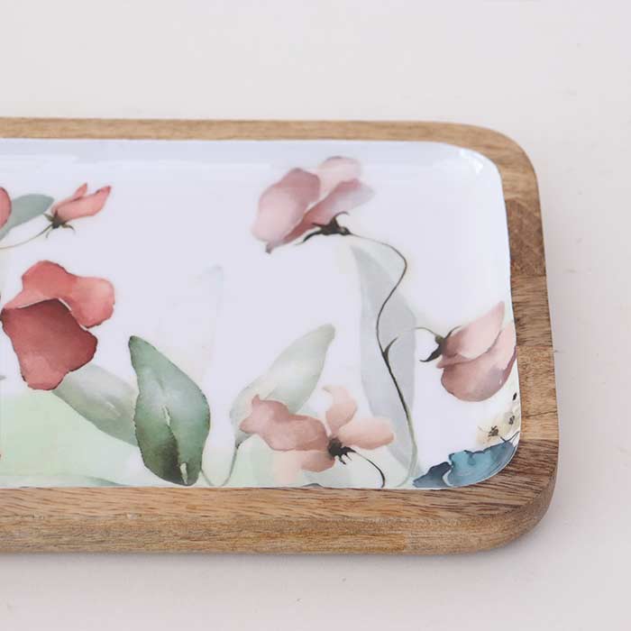 Vassoio rettangolare, realizzato in legno di mango, con decorazione laccata lucida.