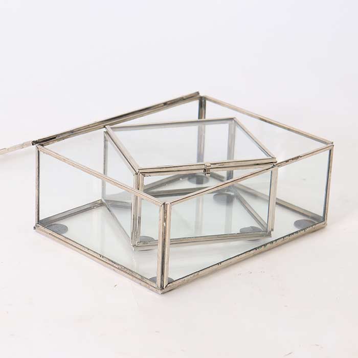 Set due scatole rettangolari realizzate in metallo, finitura argento lucida, e vetro trasparente.