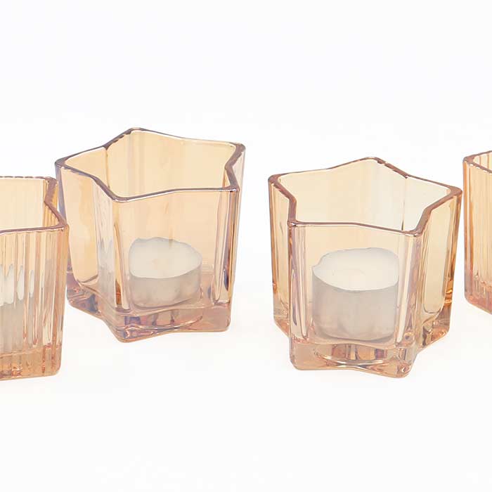 Portacandela a forma di stella realizzata in vetro, finitura dorata, in due modelli: rigata e liscia.