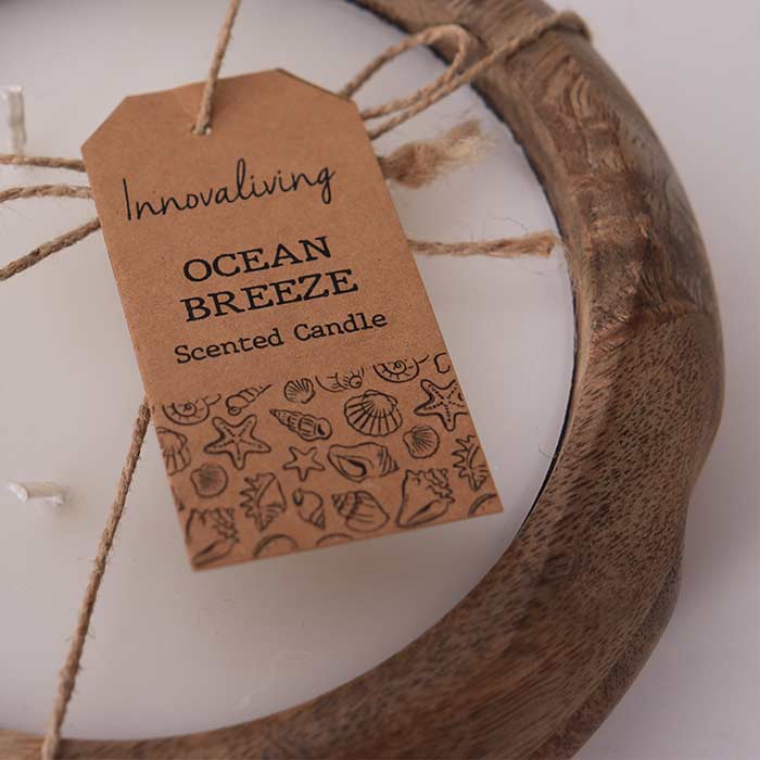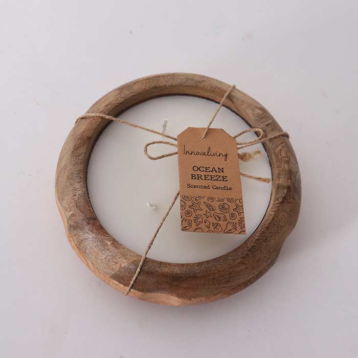 Contenitore tondo realizzato in legno, finitura naturale, con candela profumazione ocean breeze, 3 stoppini.