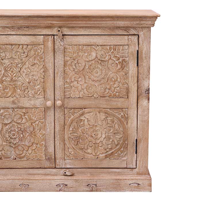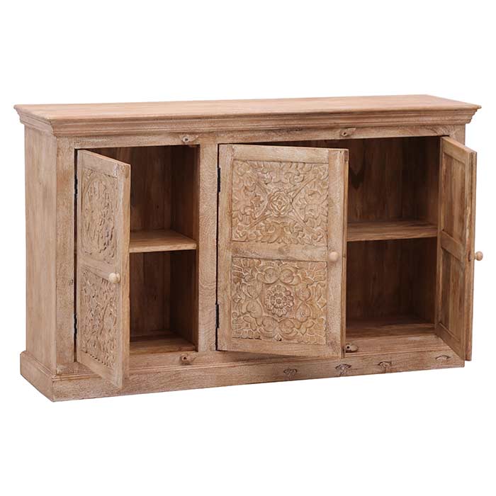 Mobile realizzato in legno con finitura sabbiata bianca, composto da tre antine intarsiate e maniglia anticata.